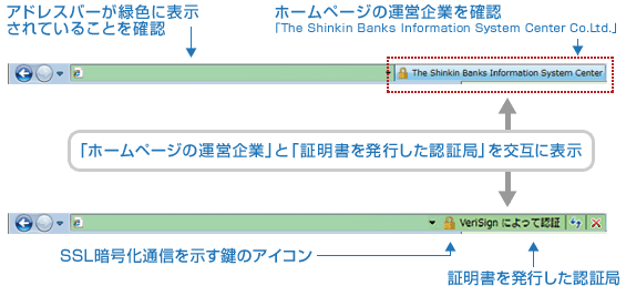 「EV SSLサーバ証明書」の導入後は、Internet Explorer8以降の高セキュリティのブラウザからしんきん電子記録債権サービスのログイン画面「https://www02.shinkin-ib.jp」へアクセスした際に、ブラウザのアドレスバーが緑に変わり、ホームページの運営企業名(The Shinkin Banks Information System Center Co.Ltd.注1.)および証明書を発行した認証局名(VeriSign)の情報が表示されるため、フィッシングサイトとの判別が視覚的にできるようになります。